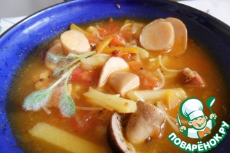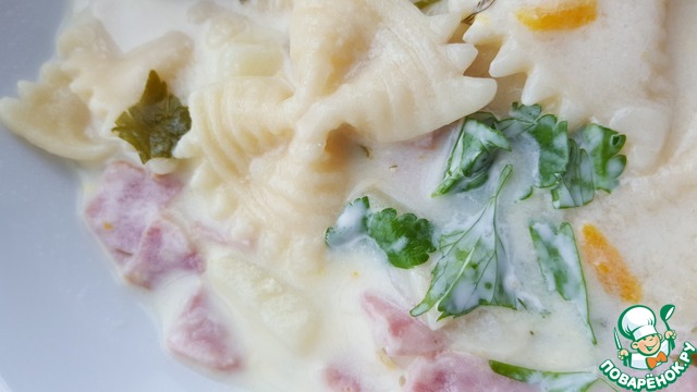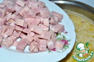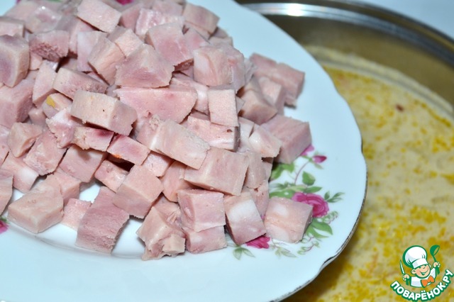 После того, как сыр растворится, добавляем ветчину, доводим до кипения и варим на маленьком огне минут 10.