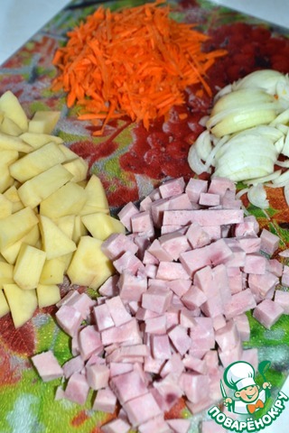 Картофель нарезать кубиками, морковь натереть на крупной терке, лук нарезать полукольцами, ветчину - кубиками.