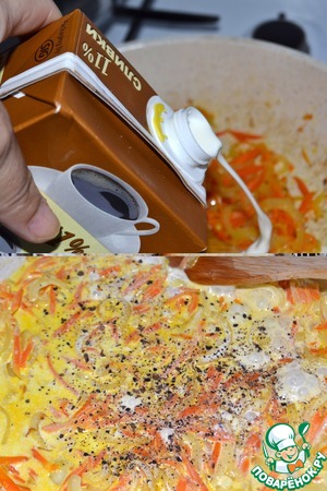 Добавляем обжаренные овощи со сливками, перемешиваем, доводим до кипения.