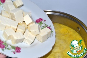 Добавляем нарезанный кубиками плавленный сыр (можно при желании натереть его на крупной терке, тогда он быстрее растворится в супе).