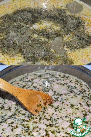 Добавляем лавровый лист, вашу любимую зелень (можно свежую, можно сушеную), доводим до кипения и отключаем огонь. Пока настаивается суп, из хлеба, нарезанного кубиками, поджариваем сухарики (я делала в микроволновке в режиме "Аэро" - при 200 градусах 20 мин.)