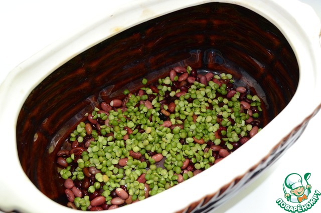 Выкладываем в горшок фасоль, горох. Фасоли ТМ Мистраль у меня осталось меньше 200 г, поэтому я добавила немного фасоли другой фирмы.