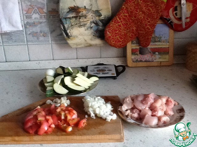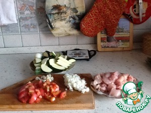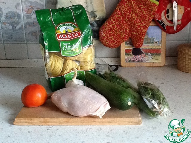 • Нам понадобится - куриная грудка, лапша, цукини, помидор, лук, чеснок, масло, зелень, соль и перец по вкусу.