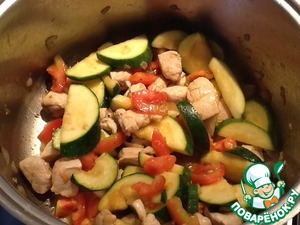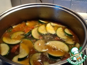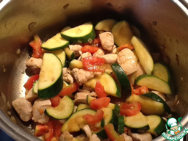 • Далее добавляем цукини, перемешиваем все, сбавляем огонь до среднего и тушим все минут 5.
