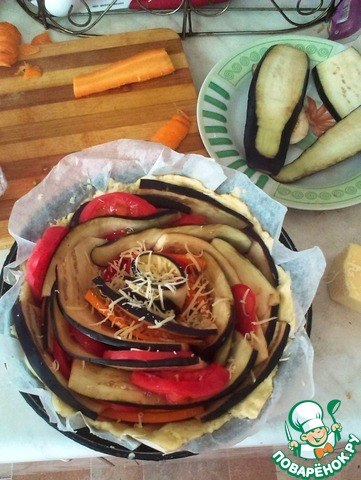 Начинаем выкладывать полоски овощей, начиная с краев и постепенно двигаясь к центру. Конечно, из-за толщины овощей у меня получилось не совсем-таки эстетично, ну ладно :)