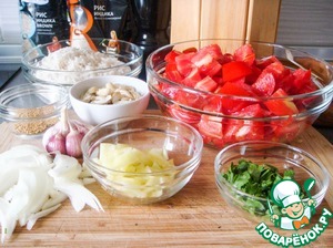 Подготовить овощи: лук нарезать перьями, очистить головку чеснока, перец чили нарезать колечками (я использую сладкий перец, т. к. не люблю острое), измельчить полстакана зелени кинзы, помидоры произвольно порезать.