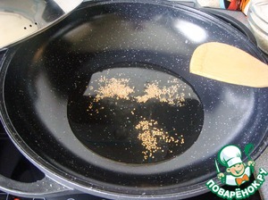 На сильном огне хорошо разогреть в глубокой толстостенной посуде/сковороде/казане растительное масло. Всыпать семена горчицы. Обжарить, помешивая, в течение 30 секунд.