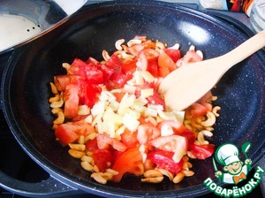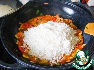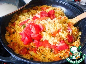 Когда томаты начнут давать сок, добавить к содержимому сковороды рис. Перемешать.