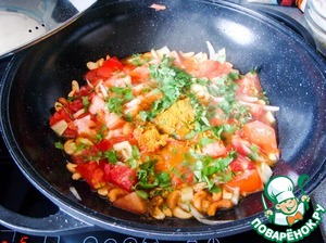 После этого выключить огонь, добавить оставшиеся томаты и аккуратно перемешать. Свежие томаты выгодно разнообразят текстуру этого блюда. Снова накрыть крышкой и дать настояться 5-10 минут.