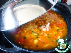 Залить водой (1часть риса:2 части воды), довести до кипения, утопить в содержимом головку чеснока, накрыть крышкой, уменьшить огонь и оставить на слабом огне на 20 минут или пока рис не впитает всю жидкость и дойдет до готовности.