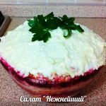 Мой самый любимый салат. Делаю его обязательно на каждый Новый год. Подобного рецепта не встречала никогда и нигде, хотя искала много раз. Раньше похожий салат продавался в одном из супермаркетов Астрахани под названием "Нежность", но состав был немножко попроще. У меня он тоже называется "Нежность", но их на сайте так много, что решила переименовать.