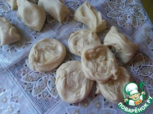 Раскатать скалкой, можно и руками немного растинуть-на готовые лепёшечки выложить ложкой начинку.