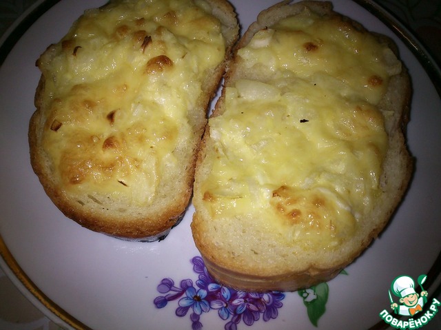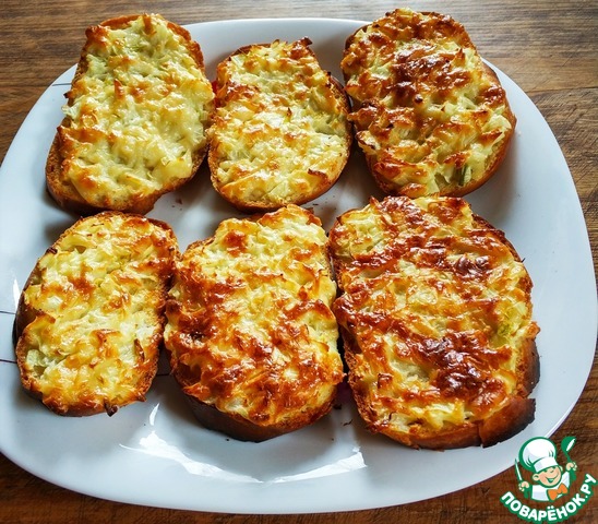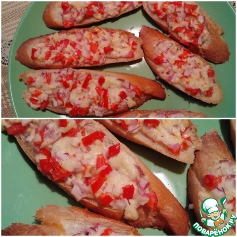 На кусочки батона выкладываем начинку, ставим в разогретую духовку и запекаем до золотистого цвета.