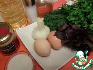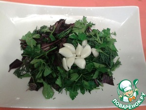 Теперь делаем сам соус. Берем небольшие пучки базилика (специалисты могут сказать, что на фото не базилик, а реган, знаю, но на рынке именно его у нас называю базиликом, это один из его красных подвидов. По вкусу он ничем не отличается от зеленого базилика, только чуть потверже веточка) пучки петрушки и укропа, отрезаем лишние черешки. Чистим чеснок