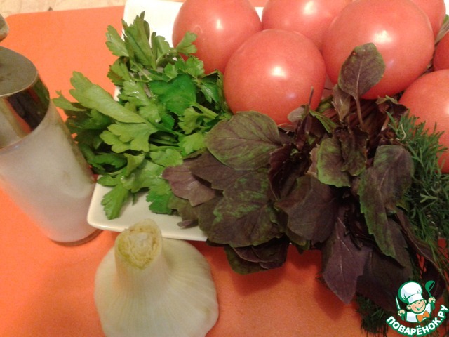 Сначала нужно мелко порезать травы (базилик, петрушку, укроп в равных пропорциях), раздавить и порезать чеснок, добавить соль и перемешать. Если помидоры недостаточно сладкие можно добавить щепотку сахара. Перемешивать и одновременно измельчать ножом. У кого есть желание, можете все растолочь в ступке.