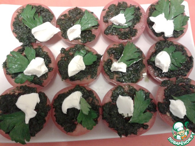 А для закуски на каждый помидорчик нужно положить немного творожного сыра и украсить зеленым листиком.