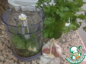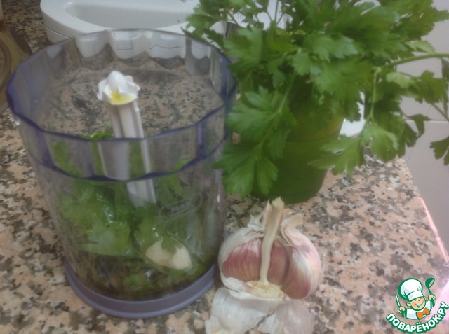 Для соуса: в чашку блендера положим пучок петрушки, зубчик чеснока, 2 столовые ложки воды, оливковое масло, соль, перец и сок половины лимона. Взбить до однородности.
