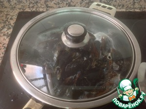 Мидии выложить на раскаленную сковороду, закрыть крышкой. Через 2-3 минуты, когда ракушки откроются, снять с огня