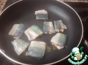 Теперь обжарим скумбрию на сильном огне 3 минуты с обоих сторон. Посолить, поперчить. Дольше жаришь не стоит, иначе рыба станет сухой