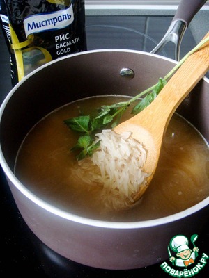 Стакан риса залить тремя стаканами бульона, довести до кипения, накрыть крышкой, уменьшить огонь и варить около 20 минут до готовности риса.