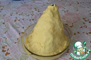 1. Тесто на крышку тажина заводим любое густое дрожжевое, которое Вам нравится. Я развожу в теплой воде дрожжи с сахаром. Через 5 мин. добавляю яйцо, соль, кефир и муку. Завожу густое тесто. Ставлю в тепло на 1-1,5 до увеличения в объеме в 2 раза. Щепотку шафрана заливаем горячей водой и ставим настаиваться.
