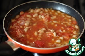 Вареную фасоль добавить в сковороду с поджаркой, перемешать, если получается слишком сухо, добавить немного томатного сока.