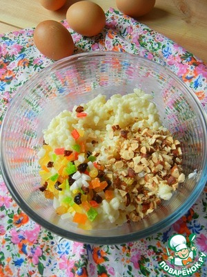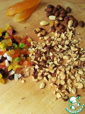 С изюма и цукатов слить воду и обсушить их бумажным полотенцем. Затем цукаты нарезать небольшими кусочками, орехи мелко порубить. -