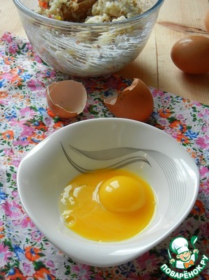 Желтки отделяем от белков и добавляем к рису. Белки взбиваем в крепкую пену и аккуратно вводим в рисовую смесь.