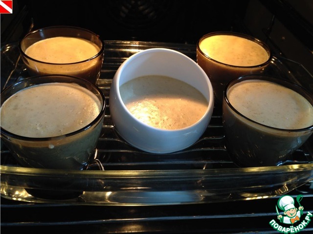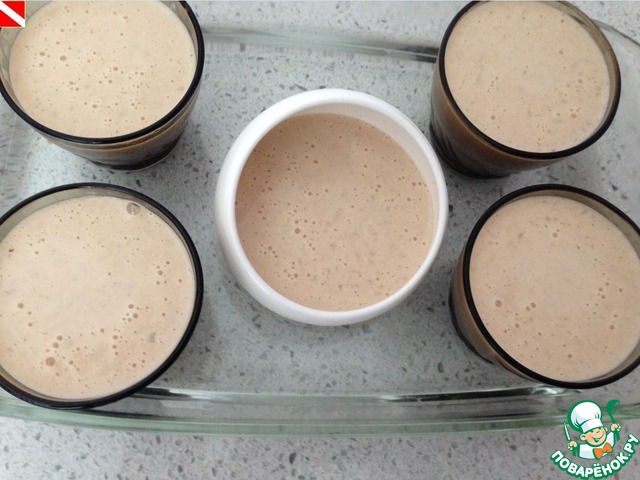 Разливаем в порционные огнеупорные формочки ( у меня таковых не имеется, поэтому делаю в обычных стаканчиках). Чем меньше по размеру будут ваши формочки, тем быстрее приготовится крем. Можно использовать стеклянные баночки из-под джема или детского пюре. Ставим формы в глубокий противень и заливаем кипящей водой, чтобы вода доходила до 3/4 высоты наших форм.