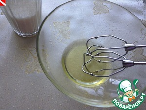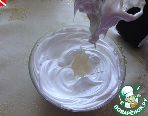 Сначала приготовим меренги. У меня такой рецепт: 2 белка комнатной температуры начинаем взбивать, постепенно добавляя сахар. Взбиваем до жестких пиков (белок начинает накручиваться на лопасти миксера).