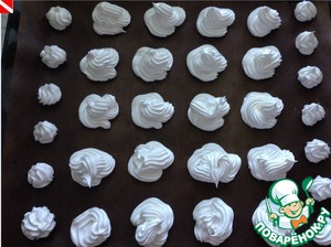 При помощи кондитеского мешка отсаживаем меренги на противень и сушим в духовке при 100 градусах примерно полтора часа.