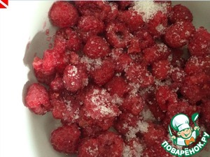 Займемся конфитюром. Малину засыпаем сахаром, добавляем лимонный сок. Ставим на огонь, доводим до кипения и когда ягодки малины потеряют свою форму