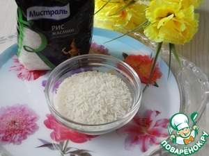 Отмерьте рис. Промойте его. Я использовала Рис белый ароматный «Жасмин». Это особый сорт ароматного риса, произрастающий на высокогорных плато Таиланда. При варке зерна риса Жасмин немного слипаются но сохраняют свою идеальную форму и приобретают ослепительно белый цвет.