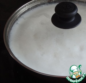 Засыпьте рис в кастрюлю с антипригарным покрытием и толстым дном (я воспользовалась сковородой), влейте 500 мл молока. Доведите до кипения, периодически помешивая. Убавьте огонь до самого слабого и помешивайте, пока молоко не осядет, затем накройте крышкой и варите 15 -20 минут, время от времени перемешивая.