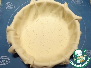 Аккуратно перекладываю тесто в форму, вилкой делаю проколы в тесте, закрывающем дно формы.