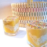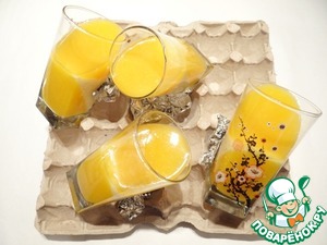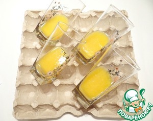 Этот десерт красиво смотрится в квадратных стаканах, я смогла найти стаканы только с квадратным дном, но и в нем десерт смотрелся не хуже. Укладываю стаканы на решетку для яиц так, чтобы жидкость в стакане была наклонена примерно на 45 градусов. Аккуратно вливаю в стаканы персиковое желе. Помещаю решетку в холодильник до полного застывания желе.