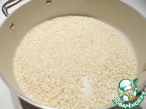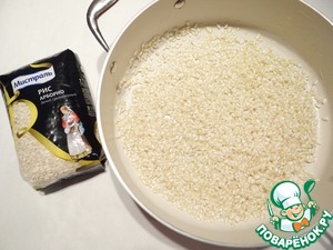 В это время готовлю ризотто. Для его приготовления я использовала рис "Арборио" компании "Мистраль". В сковороде нагреваю оливковое масло, добавляю рис, обжариваю до прозрачности риса.