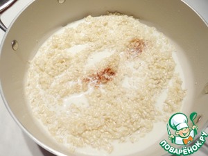 Затем небольшими порциями начинаю добавлять горячее молоко. Рис постоянно помешиваю.