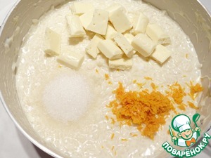 Когда рис будет готов (рис в середине должен быть чуть-чуть сыроват), добавляю дольки белого шоколада, цедру апельсина, сахар, ванилин.