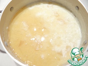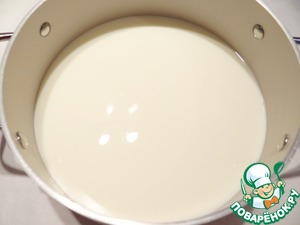 Готовлю рисовую прослойку. В кастрюлю наливаю молоко, добавляю сахар. Довожу молоко на плите до кипения.