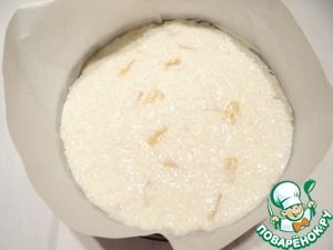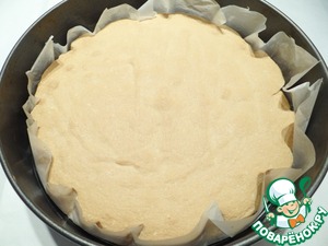 Бисквит помещаю в форму, делаю бортики из пергамента, выкладываю на бисквит рисовую прослойку и убираю в холодильник примерно на 1 час.