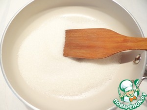 Готовлю абрикосовую прослойку. Нагреваю на плите небольшую сковороду, добавляю сахар.