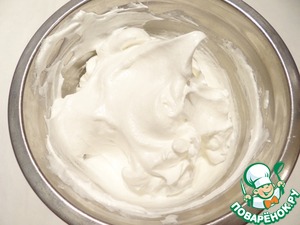 Готовлю бисквит. Желтки отделяю от белков. Холодные белки взбиваю с щепоткой соли до устойчивых пиков, постепенно добавляю сахар.