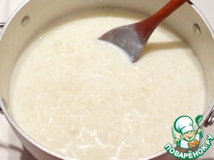 В кипящее молоко засыпаю промытый рис, убавляю огонь до минимального, закрываю кастрюлю крышкой и готовлю рис примерно 25 минут, периодически помешивая.
