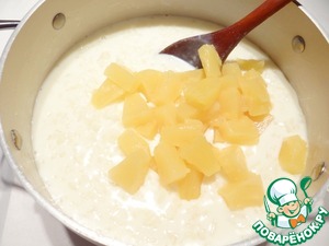 Добавляю в рисовую кашу кусочки консервированного ананаса, перемешиваю и снимаю кастрюлю с огня. Оставляю кашу остывать при закрытой крышке.