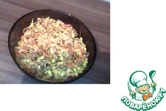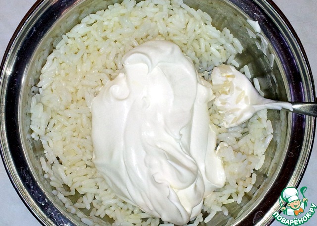 В рис положила все овощи, которые нарезала и добавила кукурузу. Часть салата положила в пиалу.