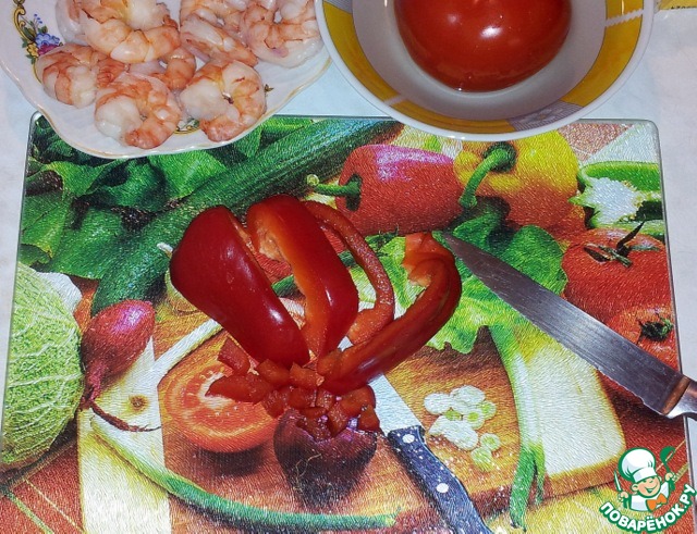 Убрала рис со сливками в холодильник и нарезала овощи. Помидор ошпарила кипятком и оставила минуты на три. Нарезала перец, зелёный лук, очищенный от кожицы помидор и половину креветок. Вторую половину креветок оставила для украшения.