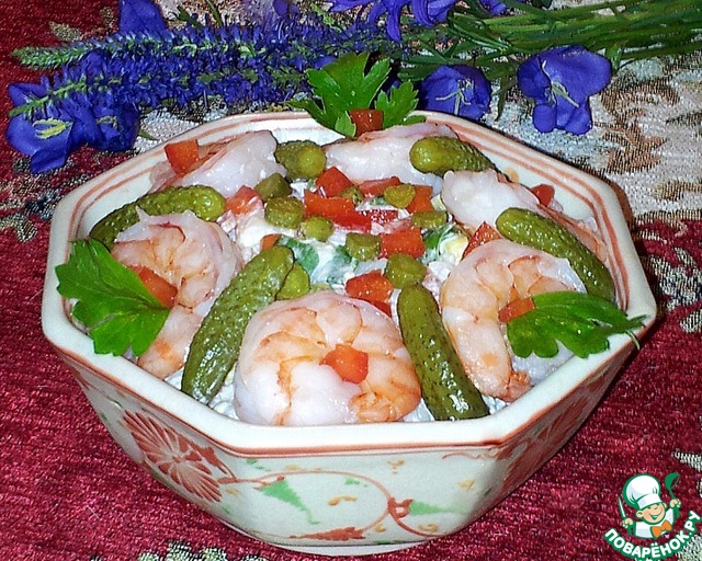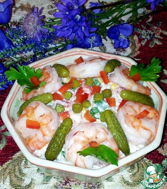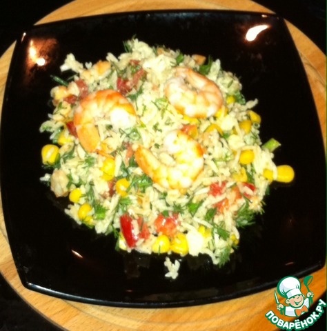 Вкусный, сочный рисовый салат с тигровыми креветками и овощами.