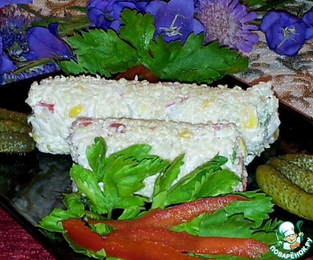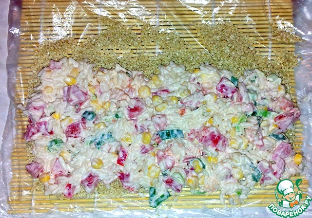 Другую часть салата скрутила в циновке рулетом. Циновку я положила в пакетик и насыпала на неё кунжут. На кунжут выложила салат и закрутила рулет. Циновку с салатом убрала в холодильник.
