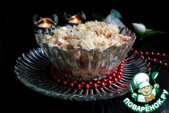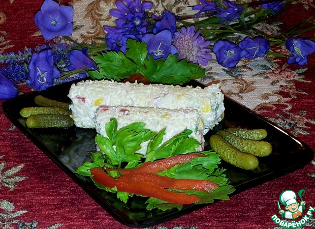 Верх салата украсила листочками петрушки и корнишонами. По желанию посыпать сверху семенами кунжута.